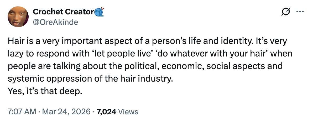 For one, I don’t love my hair. I know this is very blasphemous to admit, but it’s true: I don’t love it. I don’t hate it, I wouldn’t say that, but love it I certainly do not. If I could trade my type four textured hair for like a 3B or 3A curl pattern, I would.1 But I love having hair. I love not being bald. I love that I have edges and length and some fullness to my curls. Length and fullness are the things that make it easier for me to enjoy a twist out or a wash and go as much as a silk press. I appreciate the versatility of styles that are available to me and happily indulge.