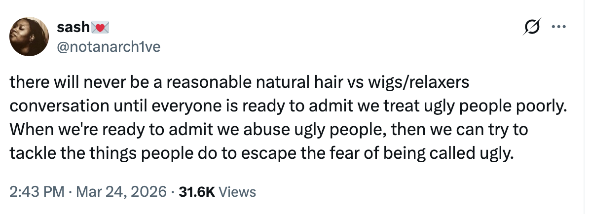 On Twitter this week, and on TikTok too, black women are pointing accusatory fingers at each other for giving into the beauty standards that compel so many of us to tuck our hair away under wigs and weave. Over on Substack, meanwhile, women of all colors are aghast that some of us are letting feminism down by normalizing or even considering Ozempic or fillers or plastic surgery.