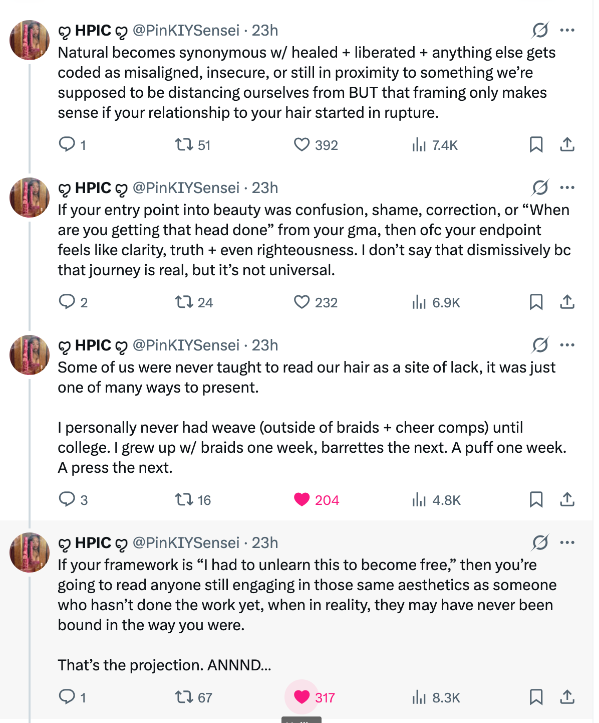 I may not love my hair, but I do my best to take care of it and I take pride in the results of that effort, so I don’t think pretending to love it is necessary. After all, I’ve been natural my entire life and never had a perm. I only get a silk press once a year, in the winter. I don’t lay my edges down or use gel to slick my hair back if I’m just putting it up or in a bun. I get kinky sew-ins and kinky straight extensions and ponytail attachments to match my texture. Just because I don’t love my hair doesn’t mean I think it’s ugly. It’s not like I’m afraid to be seen without a wig or anything. I know my natural hair is beautiful and not inferior to looser curl patterns. I just think my hair is tedious to manage sometimes, and don’t love it for that reason, and that’s that.3